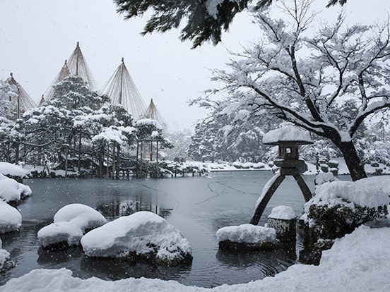 日本三名園のひとつ。代々の加賀藩主が長い歳月をかけて完成した林泉廻遊式庭園。春の桜、夏のカキツバタ、秋の紅葉、冬の雪吊りと四季折々に趣があります。