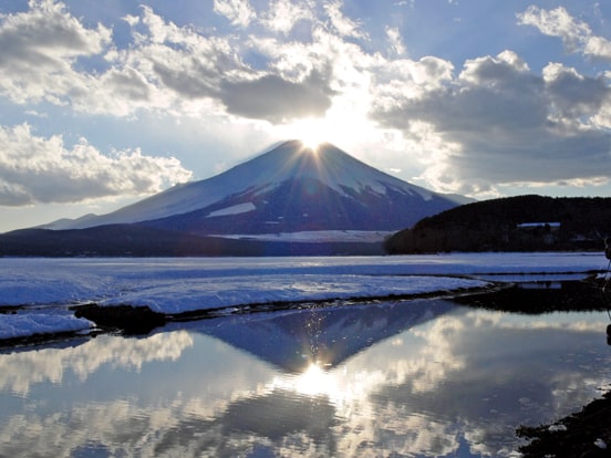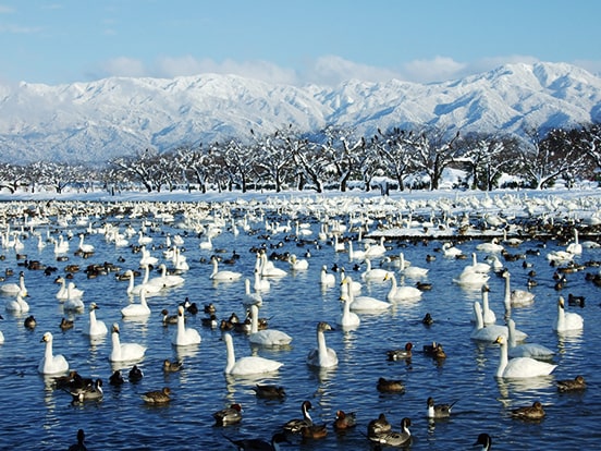 毎年冬、シベリアから約5千羽もの白鳥が飛来し、雪の中を舞い飛びます。ラムサール条約の登録湿地でもある瓢湖は、冬のみならず四季折々の情景が楽しめます。